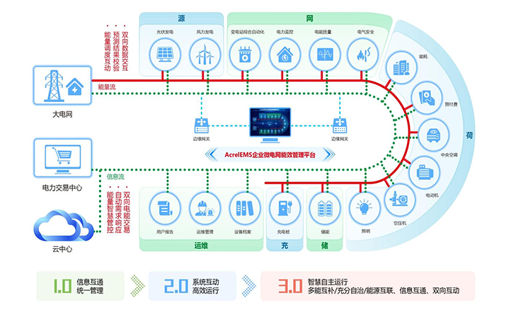簡介:1.概述 通過在源、網(wǎng)、荷、儲、充的各個關鍵節(jié)點安裝監(jiān)測、分析、保護、治理裝置, 通過高性能邊緣計算網(wǎng)關采集數(shù)據(jù)并上傳至企業(yè)微網(wǎng)平臺。平臺根據(jù)新的電網(wǎng)價格、 用電負荷、電網(wǎng)調(diào)度指令等情況,調(diào)整各系統(tǒng)控制策略并遠程下發(fā),使企業(yè)微電網(wǎng)始終高效穩(wěn)定運行, 降低企業(yè)用電成本,實現(xiàn)能源互聯(lián)、信息互動。 2.應用場所 適用于各行業(yè)企業(yè)內(nèi)部微電網(wǎng)管理系統(tǒng)的新建、擴建、改建等項目。 3.平臺結構 3.平臺功能 安科瑞AcrelEMS企業(yè)微電網(wǎng)能效管理平臺融合了電力監(jiān)控、電氣安全、照明控制、能源管控、充電樁運營管理、分布式光伏監(jiān)測、儲能管理、設備臺賬、運維管理等功能,通過一個平臺、一個APP整體的對企業(yè)用電進行集中監(jiān)控、統(tǒng)一調(diào)度、統(tǒng)一運維,并且根據(jù)當?shù)毓╇姴块T錯峰避峰計劃提前為企業(yè)制定錯峰避峰方案和預警,滿足企業(yè)